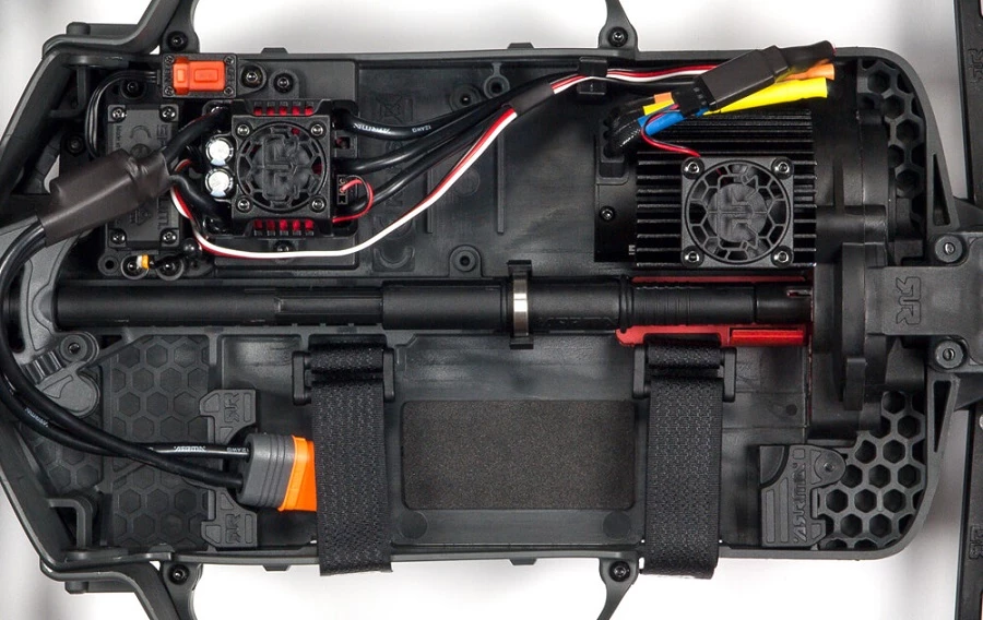 Two-piece molding screwed to the chassis contains a waterproof receiver box, servo mount, and ESC tray.