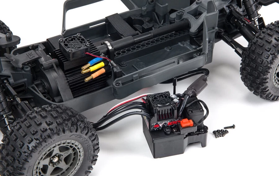 It has the ingenious modular design perfected by ARRMA® engineers for easy component access and maintenance. The power module, with improved dirt management, consists of the motor with ARRMA® heatsink and cooling fan, plus motor plate, slipper clutch assembly and gear cover. The power module can be detached from the chassis as a complete unit by removing just one screw. With the power module removed, the slipper clutch can be reached easily for adjustments by taking out three screws that attach the gear cover. The gear ratio can be finely tuned as the power module now uses a sliding motor mesh design.