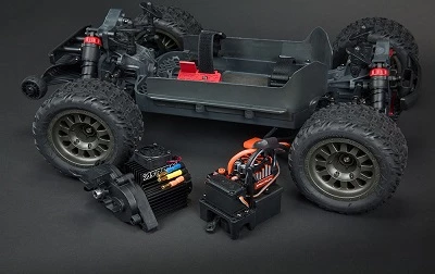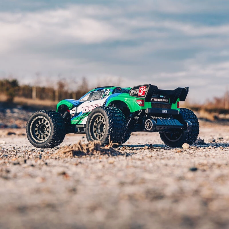 The proven tough ARRMA® 4X4 platform lets you bash at high speeds in almost any environment off-road, on dirt and grass, on parking lots and over paved and asphalt surfaces. Its durability comes from a strong composite chassis featuring extended height dirt defenders, oil-filled shocks with silicone O-rings, metal geared differentials and more. Rugged bumpers and high-traction dBoots® Katar tires mounted on tough, gun-metal colored wheels add to its unstoppable performance. The VORTEKS 4X4 3S BLX also includes a sleek, new stadium truck body with tough, injection-molded wing and protective roof skids.