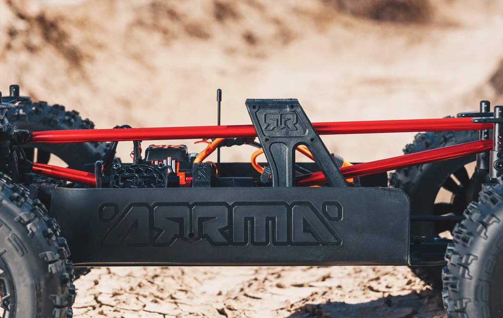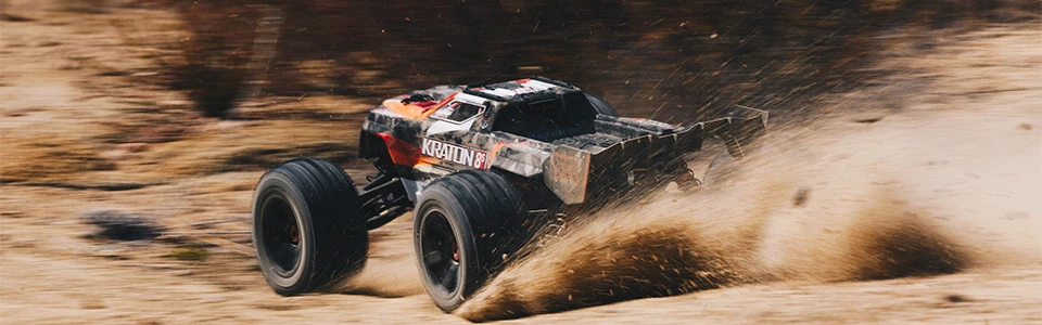 Bigger than big and engineered for brute power and toughness, the ARRMA® 1/5 scale KRATON 8S BLX 4WD Speed Monster Truck takes your bashing ability to the next level. Its metal-reinforced design lets you blast up, over, and through bruising obstacles without worry. Metal shafts, turnbuckles and outdrives, plus all-metal internal gears, give the drivetrain and suspension system unstoppable strength. The anodized aluminum chassis plate features composite side pods and a triangular center brace for maximum durability. Ultra-thick composite front and rear shock towers hold massive 20mm bore, oil-filled adjustable shocks that soak-up bumps and jolts.