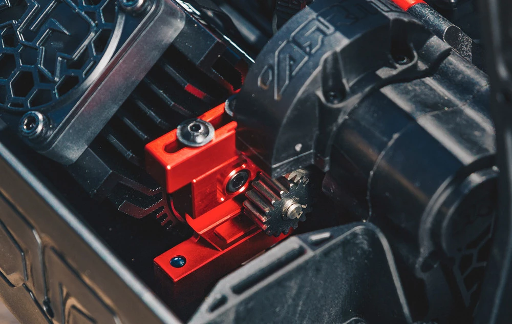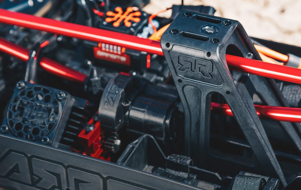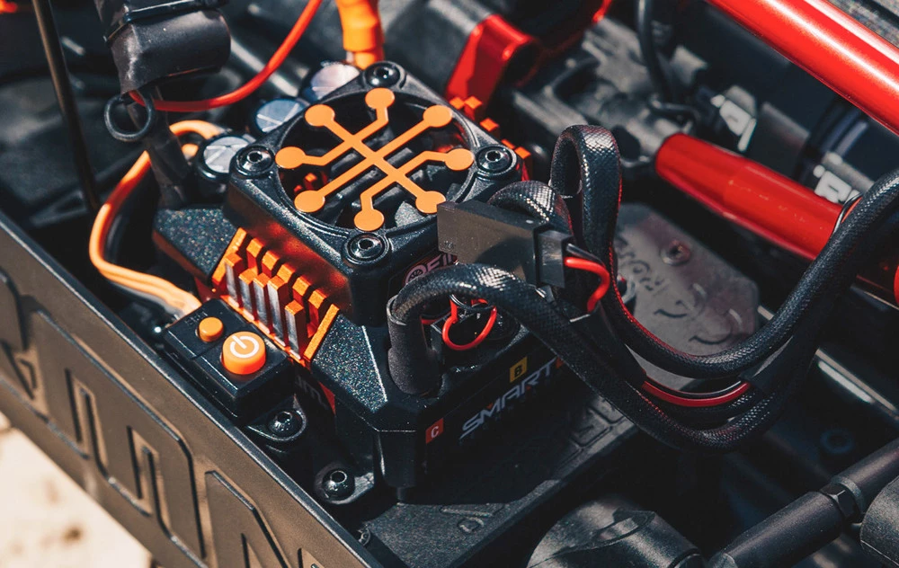 The power that sends the KRATON 8S BLX 4WD Speed Monster Truck charging easily over challenging terrain comes from its 1250Kv Spektrum Firma brushless motor. The torque and acceleration is incredible. For quick access, the motor is mounted with three bolts onto a sliding aluminum mount.
