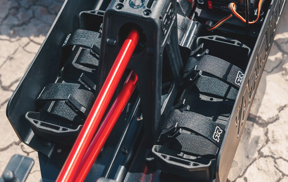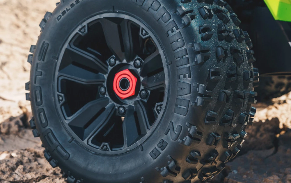 The ultra-tough KRATON truck body with high-downforce wing is available factory trimmed, painted and decaled in two striking color schemes. A center protection tower on the chassis interfaces with the roll cage for increased body durability. It all rides on multi-split spoke wheels with strong, durable aluminum wheel hubs, and multi-terrain dBoots® COPPERHEAD 2 SB tires with a tread pattern designed for extreme, all-terrain action.