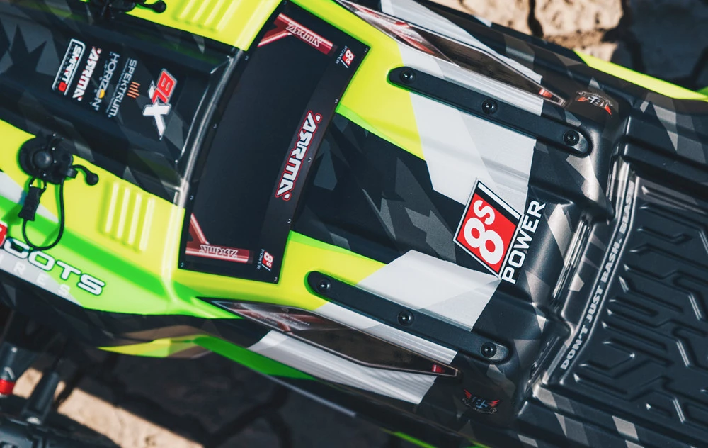 The waterproof electronics module also designed for easy access houses and protects more innovative Spektrum equipment. ARRMA® has equipped the KRATON 8S BLX 4WD Speed Monster Truck with a state-of-the-art Firma Smart 160A ESC and SR6100AT AVC® (Active Vehicle Control®) receiver. Innovative connectivity enables all the Smart electronics to send valuable telemetry data to the included Spektrum DX2E Active® transmitter without requiring multiple wires, sensors, modules and links. Just download the free Spektrum Dashboard App to your mobile device, which connects wirelessly via Bluetooth to the DX2E transmitter. Then you can view motor RPM, ESC temperature, receiver voltage, drive pack voltage and more data in real-time.