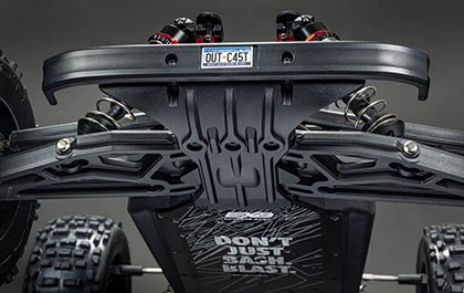 Designed Fast, Designed Tough may be an understatement when describing the OUTCAST 6S BLX Extreme Bash Stunt Truck. Made of strong anodized 7075 T6 aluminum, the laser-etched chassis plate gains further rigidity from front and rear aluminum chassis braces. Strong composite chassis side pods, along with a center body support and brace, provide even more rugged resilience. Durable steel driveshafts plus all-metal diff outdrives and gearbox internals keep the heavy-duty 4-wheel drivetrain rolling over punishing tracks. An EXB-toughened suspension system smooths the ride, with a steel rear suspension mount and adjustable oil-filled shocks mounted on 7075 T6 anodized aluminum front and rear shock towers.