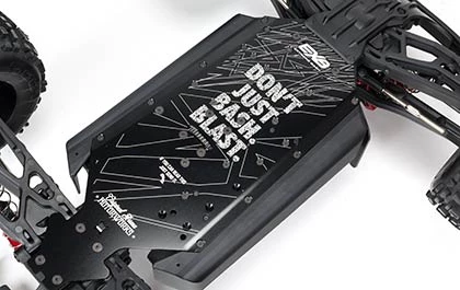 | BUILT FOR EXTREME BASHING Rugged chassis components, including all-metal diff outdrives and gearbox internals, a heavy-duty drivetrain, strong composite chassis side pods, durable steel driveshafts, and more contribute to unstoppable bashing performance. The EXB front bumper and skid plate let you fearlessly tackle almost anything that stands in your way. | DESIGNED TOUGH The OUTCAST 6S BLX Extreme Bash Stunt Truck takes Designed Fast, Designed Tough to a new level. Made of strong anodized 7075 T6 aluminum, the laser-etched chassis plate gains further rigidity from front and rear aluminum chassis braces. |