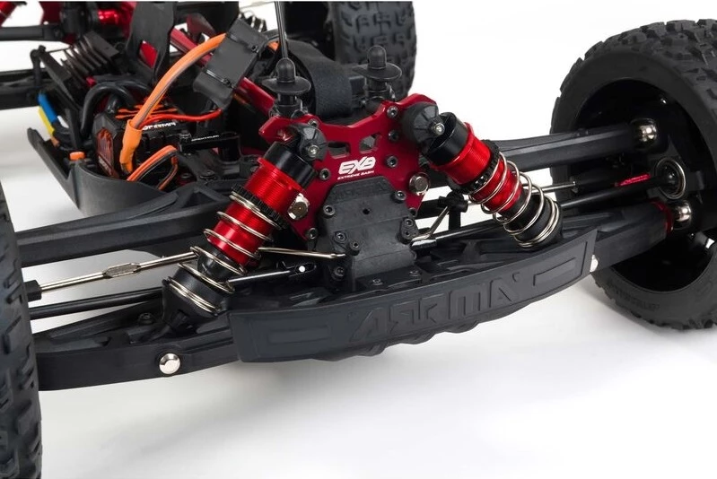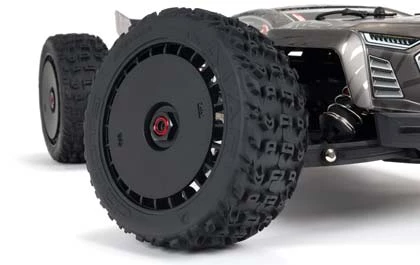 | LARGE OIL-FILLED SHOCKS These adjustable, aluminum-bodied, oil-filled shocks are mounted on EXB 7075 T6 aluminum front and rear shock towers. Along with the heavy-duty front and rear arms, they provide smooth travel over rough off-road tracks. | WHEELS & TIRES The durable, belted dBoots® Katar tires with medium-compound foam inserts offer long-lasting performance and feature an aggressive tread pattern for excellent traction on a wide range of surfaces. The tires are mounted on tough, 4.2″ MT wheels with durable hubs. |