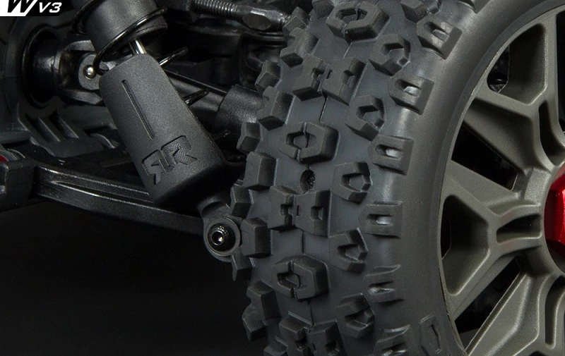 The self-bleeding, oil-filled shocks, now with silicone O-rings, use a tried and tested, coil-over design for simple maintenance and amazing handling. Their innovative rod-end has a molded-in spring perch for extra toughness. High chassis sides and a close-fitting buggy body limit the amount of dirt and debris that can get into the chassis tub. Front and rear bumpers offer defense against impacts.