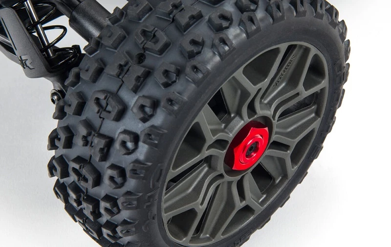 Tough gunmetal colored, multi-spoke wheels with vented dBoots® 2-HO tires give the 1/8 scale TYPHON 4X4 3S BLX RTR Speed Buggy effective traction for bashing on almost any terrain.