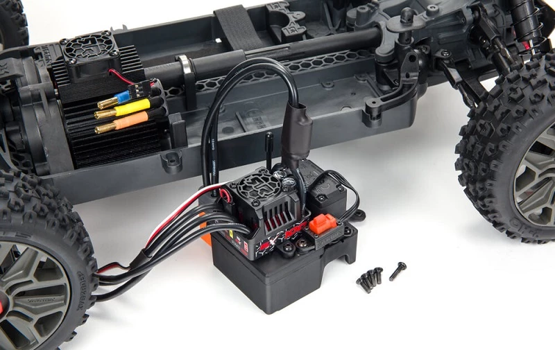It has the ingenious modular design perfected by ARRMA® engineers for easy component access and maintenance. The power module, with improved dirt management, consists of the motor with ARRMA® heatsink and cooling fan, plus motor plate, slipper clutch assembly and gear cover. The power module can be detached from the chassis as a complete unit by removing just one screw. With the power module removed, the slipper clutch can be reached easily for adjustments by taking out three screws that attach the gear cover. The gear ratio can be finely tuned as the power module now uses a sliding motor mesh design.