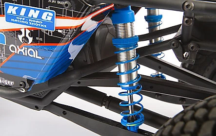 The included aluminum King/Fox shocks feature precision-machined pistons which offer smooth performance throughout the range of travel. Made to tight tolerances, these aluminum shocks feature clear-coated, polished aluminum bodies and are threaded for quick ride height adjustments and pre-load tuning ability. The rear shocks are mounted on the links rather than at the axle, allowing for more suspension travel and better high-speed handling.