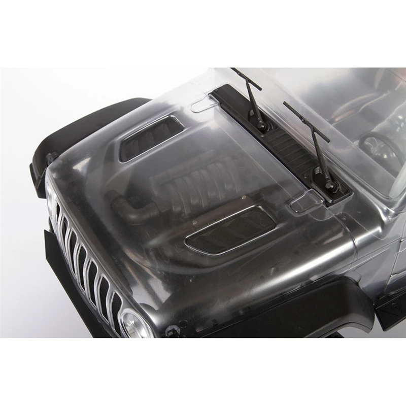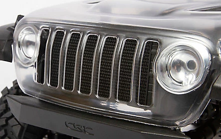 The clear scale Jeep® Wrangler Unlimited body mirrors its full-size counterpart with a detailed interior for “super scale” looks. The interior has a molded roll cage, steering wheel, and driver head. There are many molded scale details on the body, too: front radiator/light buckets; front hood vents; front cowl; windshield wipers; mirrors; door handles; and fuel door.