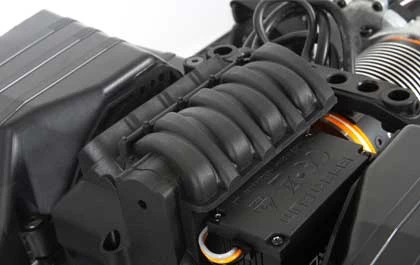 | Scale Engine Detail A replica V8 engine covers and protects the included Spektrum Firma Smart ESC while adding to the model’s realistic appearance. |