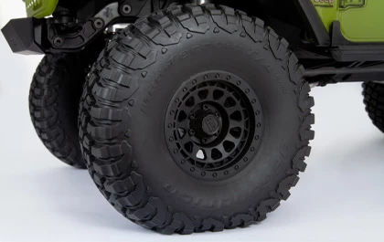 Massive, 7″ tall BFGoodrich® KM3 tires provide excellent grip and ground clearance for dirt, rocks, and all other off-road surfaces. They’re mounted on licensed Black Rhino Primm injection-molded, 3-piece beadlock wheels so that the tires can be removed and replaced easily without gluing. Forest, desert, lake, mountains…the SCX6 Jeep® JLU Wrangler 4WD is ready to go anywhere.
