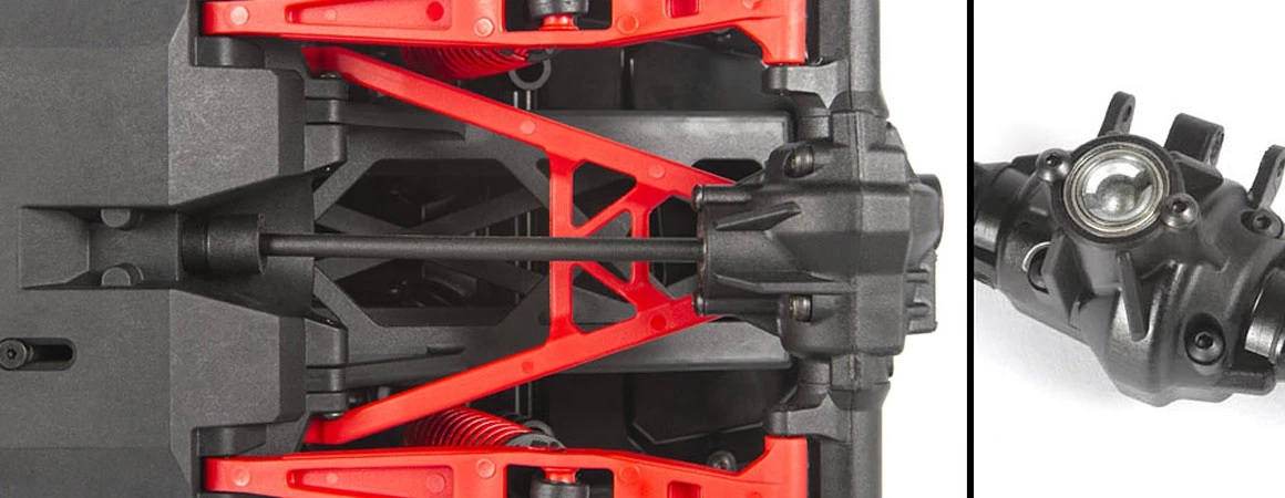 To help keep the scale premise in check, simply shrinking down an existing axle was just not an option. In keeping the proportions correct along with yielding ample terrain clearance a new axle was designed, the AR18. Features include a compact two-piece design, captured pinion gear, and three-linked rear suspension with integrated sway-bar like support design for improved handling.