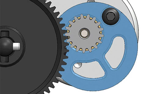 Adjusting gear mesh to accommodate different sized pinion or spur gears has never been easier with the help of a cam style motor mount design. The front top plate secures the cam motor plate in place and all the screws thread down into the chassis, eliminating the need for extra-long hex drivers in order to secure the motor and gear mesh.