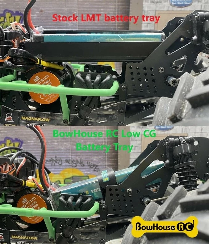 The Losi LMT has taken the solid axle monster truck world by storm. Now it’s time to raise the bar on your LMT by lowering the battery with our BowHouse RC Low CG Battery Tray for the Losi LMT. Lowering the battery significantly improves stability and will help you get the most out of this beast.