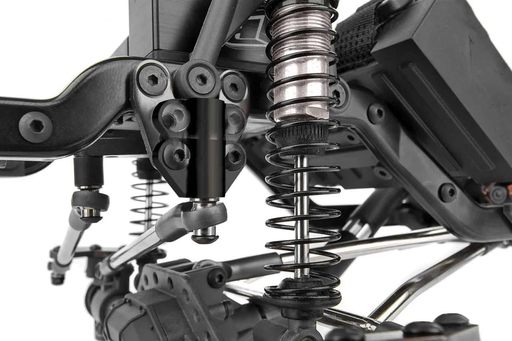 What makes the Enduro Ecto Trail Truck special? The Gatekeeper Suspension package (GKS)! The GKS package consists of rear trailing arms that move the shocks forward, allowing a larger window for shock tuning and providing improved weight bias. The trailing arms are paired with a rear anti-roll bar for a more stable and consistent suspension when crawling on the rocks. An adjustable aluminum track bar mount firmly bolted to the chassis rail gives the Enduro Ecto more reliable and responsive steering without the flex. Our shock mount inserts with multiple mounting positions allow for precise suspension tuning, whether they’re moving the shocks up, down, forward, or back.