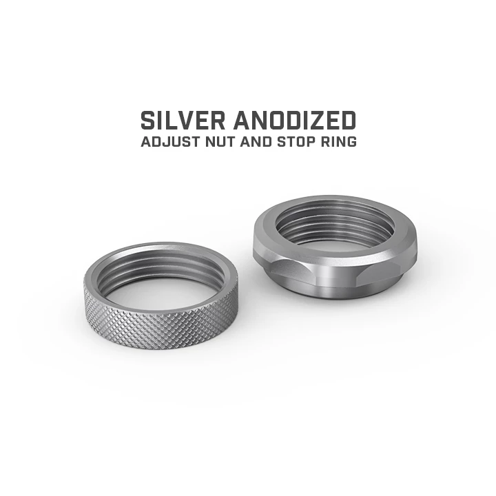 Silver anodized shock bodies, spring adjust nuts, stop rings and cartridges