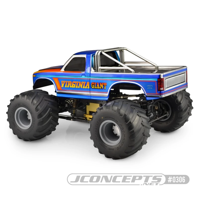 The JConcepts manufactured body measures 7.25 width and built for a 13 wheelbase truck. The body is carved with traditional rectangle arched wheel wells but can be trimmed larger for jumbo tires such as the Renegades and Firestorms, found on the typical RC monster truck. The JConcepts product includes a clear body shell, paint mask for all windows and detailed Ford and JConcepts logo decal sheet. As always, each body set is backed with JConcepts customer support and racing heritage.