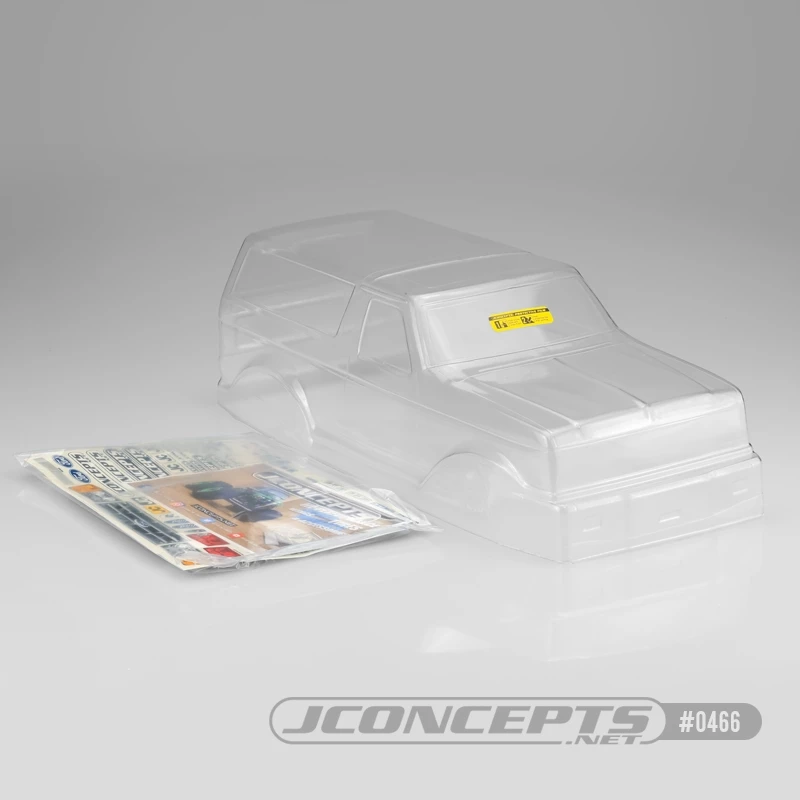 The body features flush-fitting grille and headlights, wrap-around parking lights, a minimalist grille, and an accurate and clean-looking Ford | JConcepts decal sheet. The rear roof feature on a Bronco has plenty of window coverage on the sides and rear and can either be masked using included window mask or painted for a solid look. The 10.5 wheelbase and 7 wide body fits a variety of RC monster trucks including the iconic Tamiya Clod Buster and JConcepts Regulator. When its time to fabricate a race truck or flash back to the golden years of monster truck racing by dressing out a scale build, JConcepts is World Proven Innovation and Design.