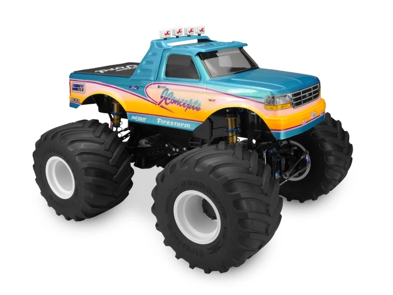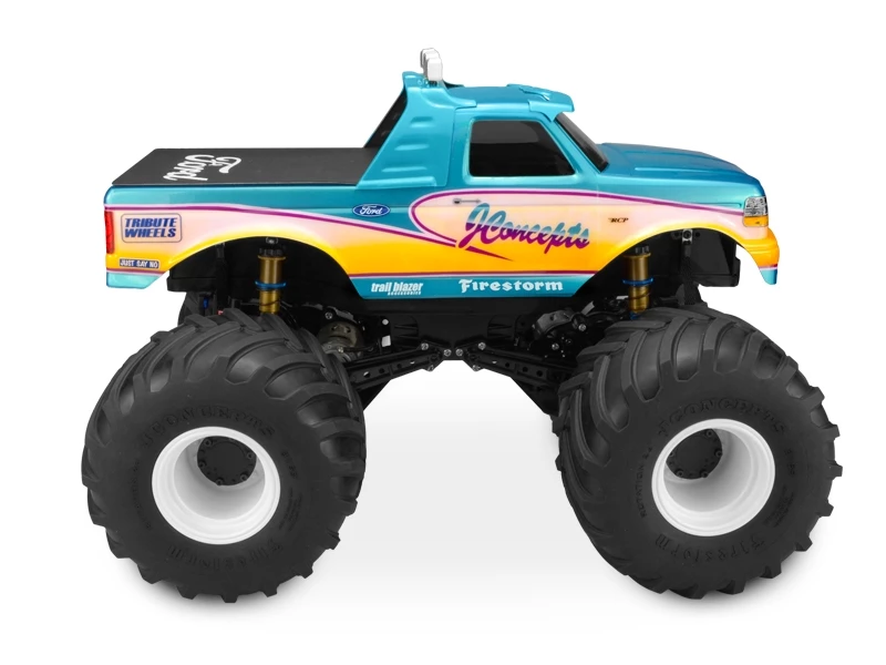 During the mid-1990s the full-scale monster truck racing scene was at its all-time most competitive. Never before had so many factory backed teams competed for the coveted racing championships during that time period. The Ford bodies were always successful, however, never had one style been so dominant. The 1993 Ford F-250 body was the standard and the top of the line in terms of looks, popularity and performance back during this hey-day of monster truck racing. Never before has this body style been available for 1/10th scale Monster Truck racing, that is until JConcepts pulled the trigger.