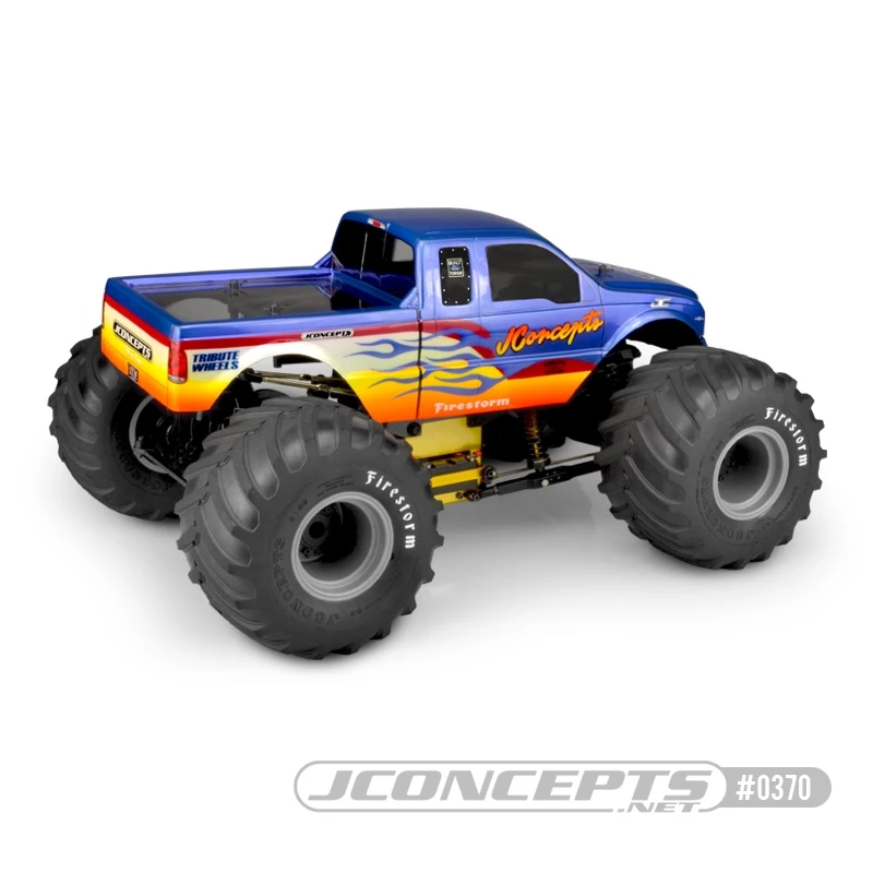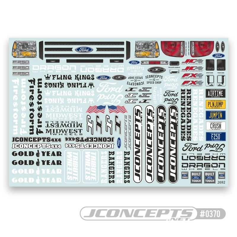 Decal design is a constant focus and with all JConcepts bodies, a quality sheet is included with grille, headlight and taillight layout. Many JConcepts logos, brands and product names have also been included to give a full-compliment of useable artwork. Best of all, the new body delivers the style that todays Monster Trucker is looking for without compromising on the rugged and dependable qualities. The Ford F-250 is a sample of the bold, new offerings constantly in the queue with JConcepts.