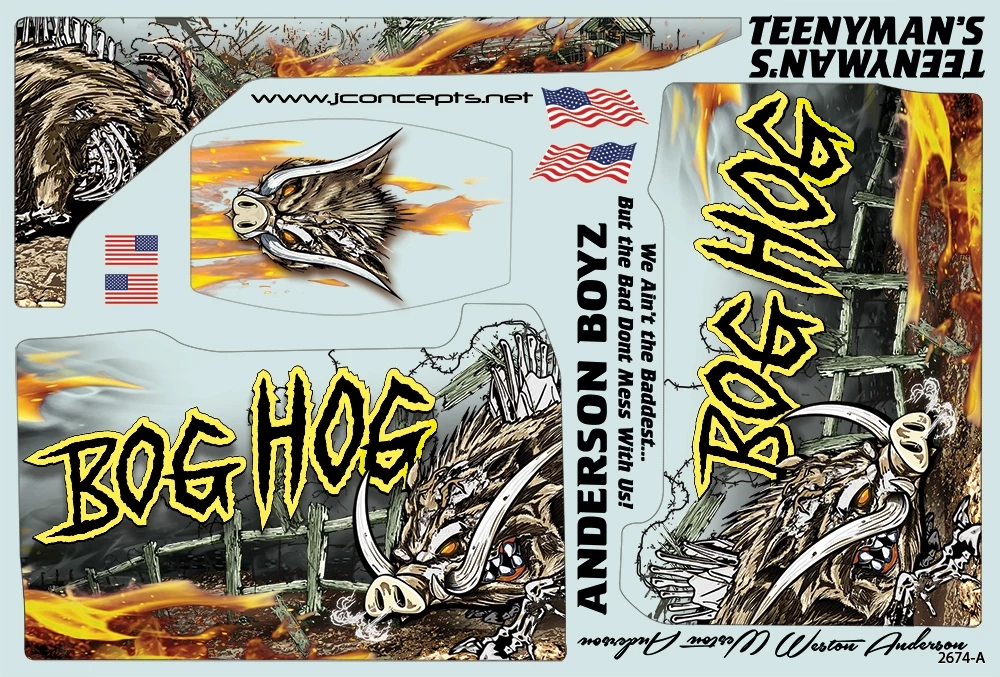 The JConcepts team met on location to photograph, measure and sketch up the 1:1 Bog Hog. Experienced industry insiders sat to discuss the project and lay plans to fit and finish the popular body to several popular chassis sets on the market. Computer drawings were completed during the Winter of 2018 and from there, professionals at JConcepts took the necessary hand finishing time to pin-point focus sections of the creation. Hood-scoop and final fitment were complete during the Spring and decal designs finished and put into production during early Summer.