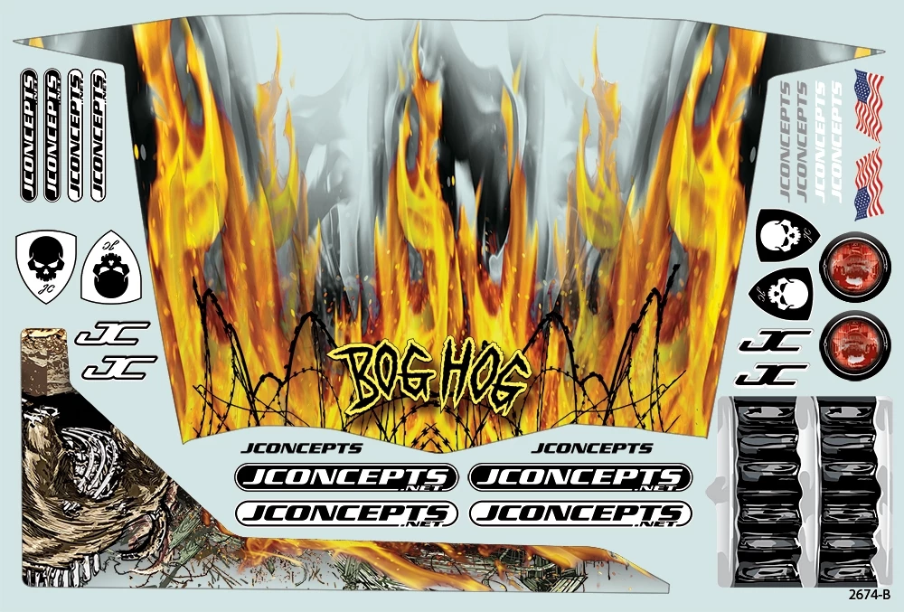 Included in the package, clear Bog Hog body, painting window mask, front hood-scoop and decal set. As always, each body set is backed with JConcepts customer support and racing heritage. Tackle the RC world fit for a beast, #gojconcepts #jconceptssling #jconceptsbog