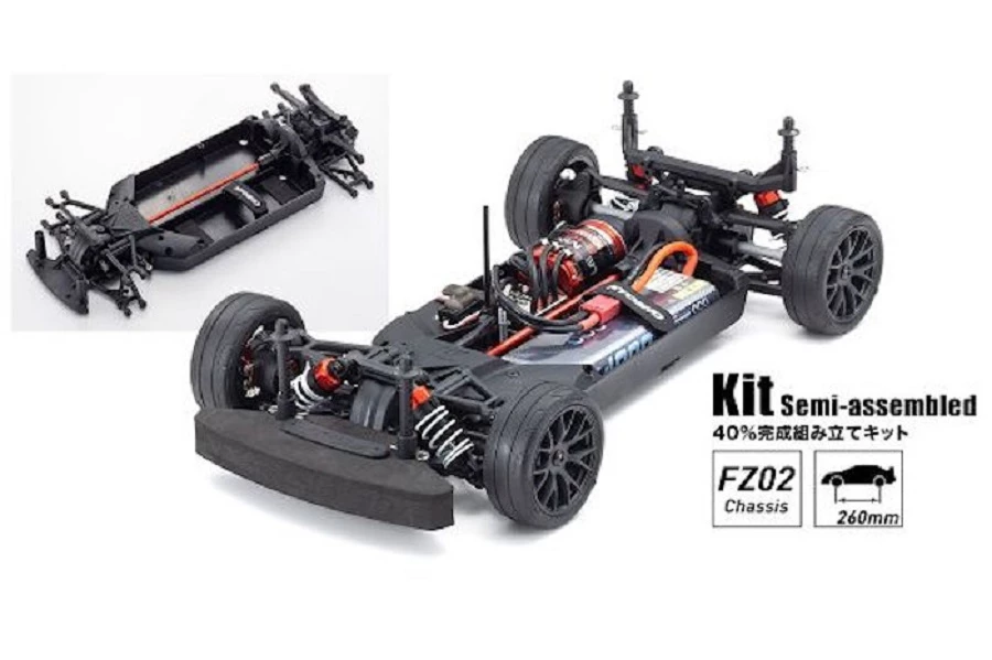 The FAZER Mk2 Readyset was created for the pure enjoyment of R/C car driving. Now available as a chassis kit, owners have the flexibility to add their own body and R/C system. Specifications have been elevated with optional parts such as HD TC center shaft S and TC universal swing shaft to enhance the unrivaled symmetrical design and front-rear suspension balance of the lightweight chassis for R/C racers to enjoy. While the deckless design looks simple, a reduced number of components improves maintenance efficiency and optimizes torsional rigidity. Incorporation of nylon material further reduces weight and improves impact resistance. With its unique design, the FZ02 chassis embodies features and performance that will appeal to R/C drivers of all levels.