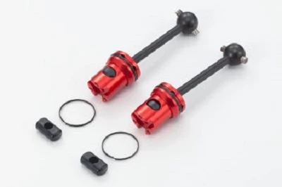 | Duralumin HD TC center shaft S (FAW209) provides increased rigidity compared to the standard resin shaft included in the Readyset. In addition to smoother driving transmission, the red anodized color has striking visual appeal. | TC Universal swing shafts (FAW202) on the front drive section dont drop out on heavy contact like dog bone shafts. In addition, the swing shafts deliver consistent drive transmission even when joint is at a wide steering angle. |