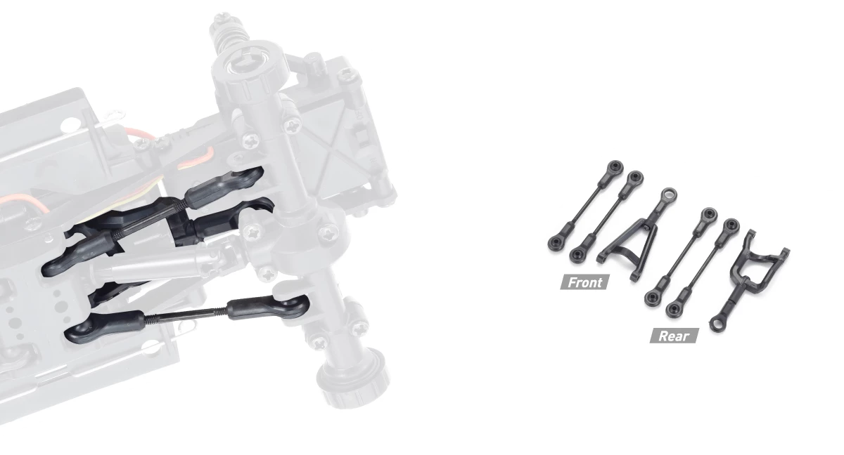 The steering servo drag link and the rugged molded tie rod are part of a steering system that delivers an incredible amount of steering angle, which results in excellent rock crawling capability.