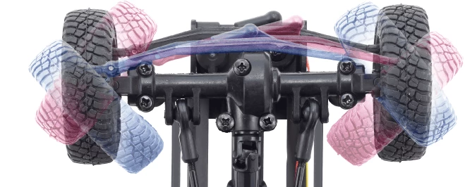 The front axle features ideal Ackermann geometry. Combined with the advanced design of the axle housing and the other steering components, This model features the tightest turning radius in Mini-Z history. It means the Mini-Z 4×4 has exceptional handling capability for anything ranging from casual driving to hard-core crawling.