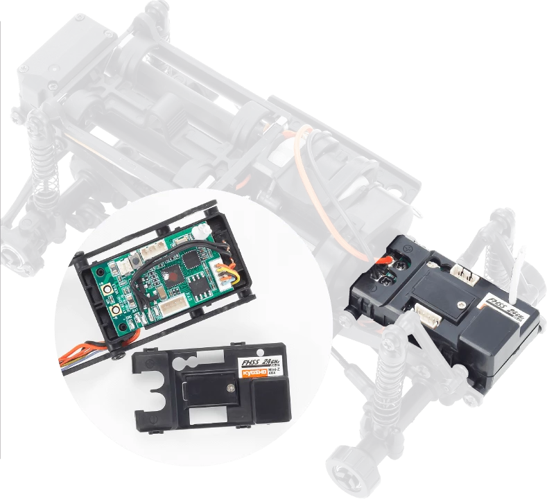 The on-board electronics are also unique to the Mini-Z 4×4, with special features that improve the crawling experience. The accessory ports on top of the board allow an optional gyro (MZW431) and an optional LED light set (MZW429R) to be easily plugged in to enhance performance and realism.