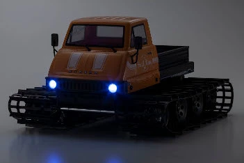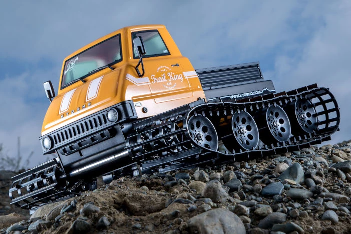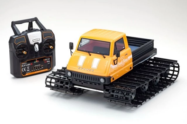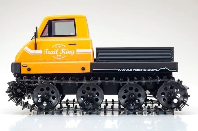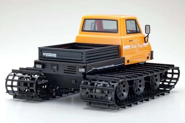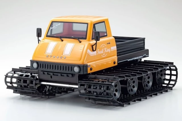The newest edition to the 1/12 scale electric belt vehicle series further enhances your outdoor experience. Kyoshos long selling Blizzard that has stood the test of time with a legion of loyal fans, has been used as a base for the new Trail King. Among its many features, a completely new body design creates the retro feel of a hard working machine. In addition to the realistic finish with separate accessory parts, the underbody incorporates a cockpit and always-on front and rear LED lights. A loading platform also provides space for a variety of things to be carried. The Trail King enhances the enjoyment of nostalgic wilderness experiences across a wide variety of scenes with a chassis boasting heavy-duty specifications for smooth and easy travel across any surface including uneven rocky roads and steep gradients. Take control with forward, reverse, left/right and the complete left/right pivot turning capability of a belt vehicle. As the model is fully pre-assembled, the advanced mechanics of the Trail King are ready to be enjoyed straight away. Compatibility with spare and optional parts for the Kyosho Blizzard allows you to expand your enjoyment of the snow and sand adventures even further.