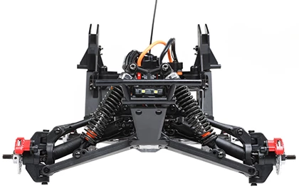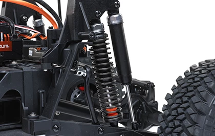 | LED Light Bars and Headlights The fun doesn’t stop even when the sun goes down with the Hammer Rey. A brilliant LED lights on the integrated light bars cast more than enough illumination for running at night. Plus, the body-mounted LEDs place only a small demand on the battery allowing you to stay out all night! | Coil-over Oil-Filled Shocks The long-travel shocks do a fantastic job of soaking up the energy from big bumps and jumps. They also feature threaded shock bodies with adjustment collars so you can fine tune the pre-load settings of the coil-over springs. |