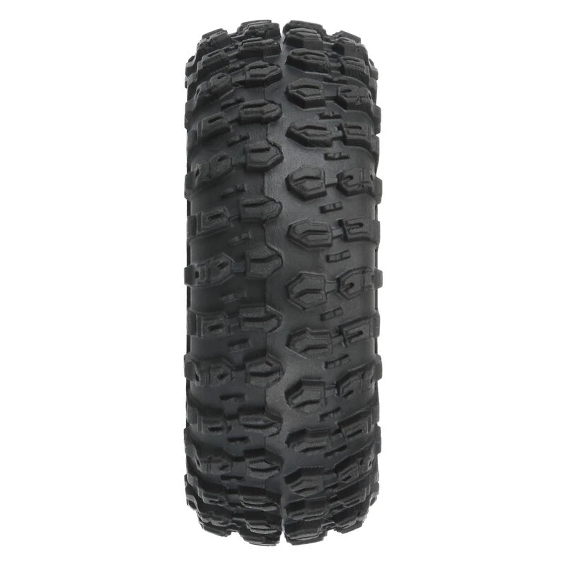 The future of SCX24 Tire Performance has arrived with Pro-Line’s all-new pre-mounted Hyrax 1.0″ Tires! Just like Pro-Line’s 1:10 size Hyrax tires, these mini tires are designed to provide maximum grip on whatever terrain your SCX24 attempts to tackle. The Hyrax features an aggressive and open tread pattern with each tread block containing Sipes for additional tread flex. The highly detailed connected tread on the sidewall of the Hyrax extends out for unmatched side-hilling performance. The Hyrax also features futuristic stepped tread blocks that create even more forward gripping edges that dig into slick rock like no other mini tire produced to date! The Hyrax 1.0″ tires are made from a super soft compound to help your SCX24 climb to new heights and the tires are supported with soft foam inserts. The Hyrax 1.0″ tires come in at an overall height of 2.10″ and a width of 0.75″.