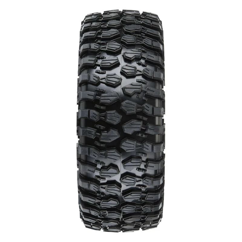 The highly detailed connected tread on the sidewall of the Hyrax extends out for added scale realism and sidewall rigidity to help prevent traction rolls. The Hyrax is made from the same G8 compound as the 1.9″ crawler tires, so you know it provides the performance and durability that you can depend on. This tire will fit directly onto the stock 2.9″ SCX6 bead-loc wheel. Don’t get left behind, take your adventure to the next level with Pro-Line’s Hyrax tires!