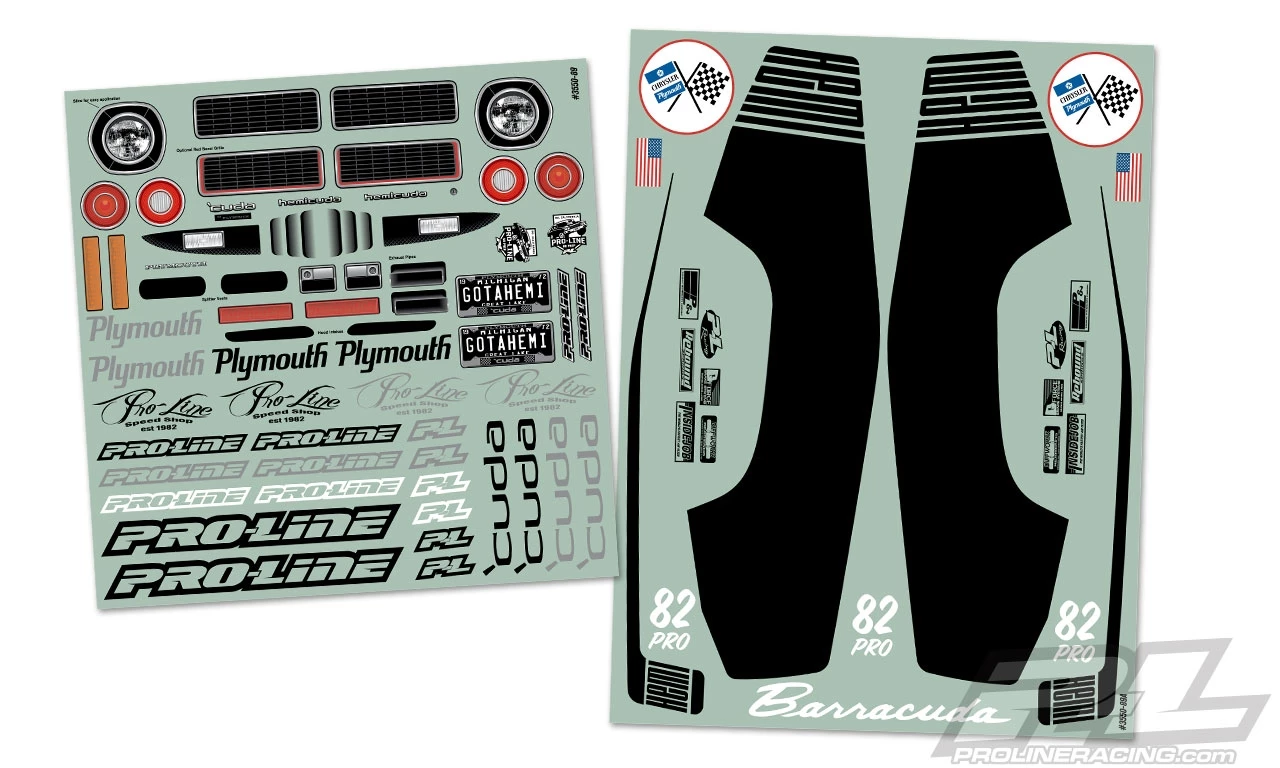 1972 Plymouth Barracuda Drag Car Clear Body. Pro-Line is proud to introduce the iconic 1972 Plymouth Barracuda body specifically designed for the growing SC Drag Racing scene! This ultra-scale body captures all the signature details of the iconic ‘Cuda, perfect for No-Prep Drag Racing. It includes an extensive decal sheet with Hemi quarter-panel livery graphics and optional add-on spoiler.