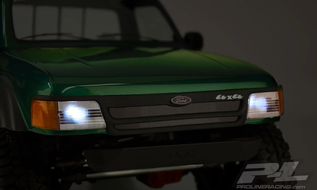 Included with this body are a molded black plastic front grill and rear taillight buckets with clear headlight and taillight lenses that allow for the addition of working 5mm LED lights (6317-00) and 3mm LED turn signals (sold separately). Also included are molded plastic side-view mirrors and door handles that are scale replicas of the full-size parts off the 1993 Ford® Ranger. The Cab and Bed are separate pieces for added scale realism and are made from crystal-clear polycarbonate that can be painted to match your favorite factory Ranger color or custom painted to whatever your heart desires.