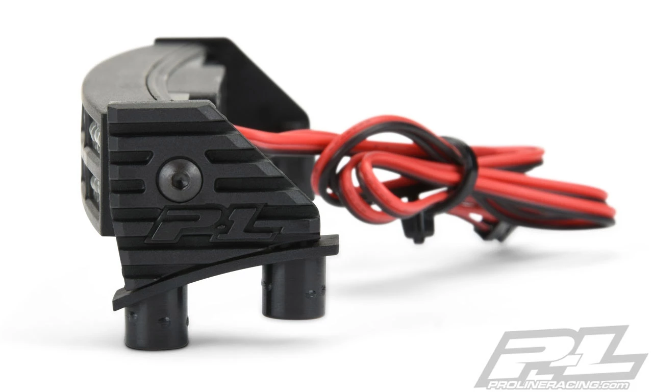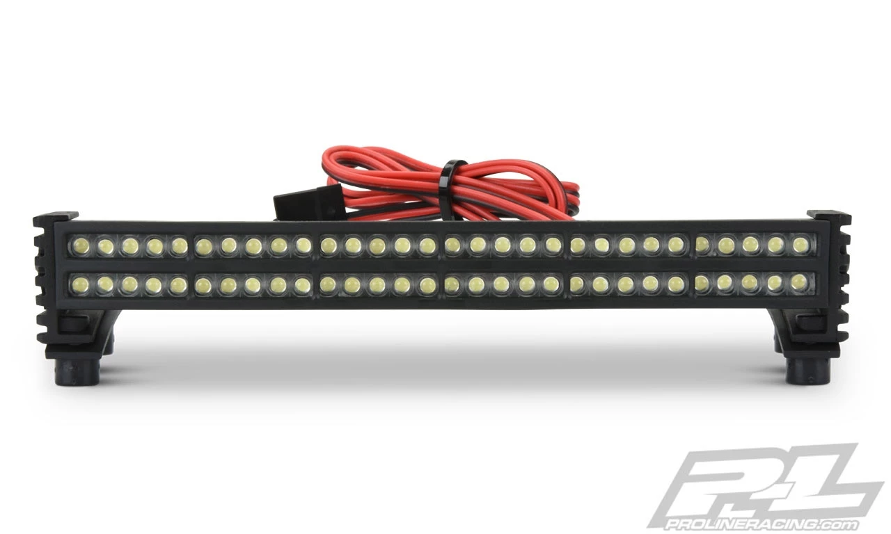 Pro-Line is proud to introduce a new Double Row 6″ Curved LED Light Bar Kit with real, working LED Lights perfect for your X-MAXX®! If you are like us, you want to use your RC car at any time of the day or night. Well now you can with the Double Row 6″ Curved Light Bar. It comes with 60 LED Light bulbs, which is 2 rows of stacked LEDs and is pre-wired with a 12″ long cable that can plug directly into your receiver for power. The Lights are rated for 6V to 12V power, so you have the option to plug directly into a 3S Lipo power source for Super-Bright LED Light! The LED Lights are housed in a durable Curved Black Nylon housing branded with a P-L logo and includes extra-thick mounts and the hardware you need to do a custom install on your X-MAXX® or another vehicle. Night bashing is all the rage so don’t get left in the Dark! Get Pro-Line’s new 6″ Curved Super-Bright LED Light Bar Kit for your truck today!