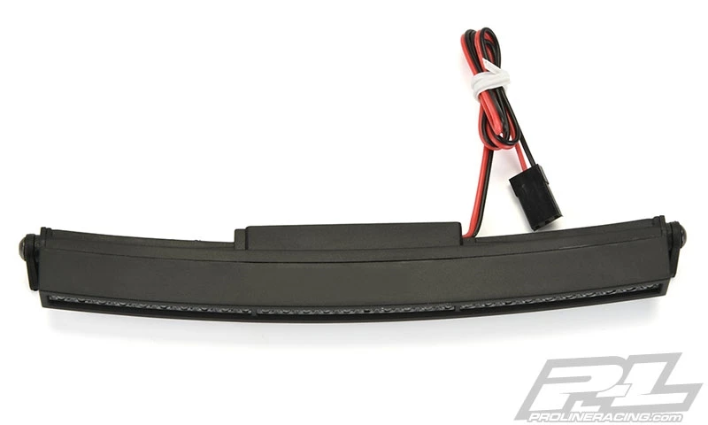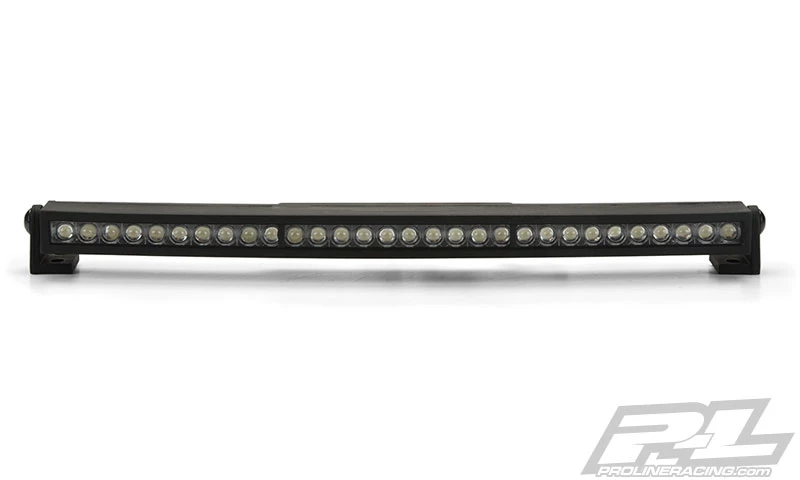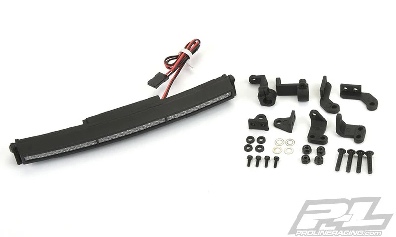 This is a 6 Curved LED Light Bar Kit. Pro-Line is proud to introduce a new 6 Curved LED Light Bar Kit with real, working LED Lights! The 6 Curved Light Bar comes with 30 LED Light bulbs pre-wired with a 12 long cable that can plug directly into your receiver for power. The Lights are rated for 6V to 12V power, so you have the option to plug directly into a 3S lipo power source for Super-Bright LED Light! The LED Lights are housed in a durable Curved Black Nylon housing branded with a P-L logo and includes the mounts and hardware you need to do a custom install on your Rock Crawler, Rock Racer, Short Course, 1:8 MT and 1:10 MT vehicle. The 6 Curved LED Light Bar has great scale appearance that will fit in with any scale vehicle. Night Crawling has become the new cool thing to do with your scale rig, dont get left in the Dark! Get Pro-Lines new 6 Curved Super-Bright LED Light Bar Kit for your truck today!