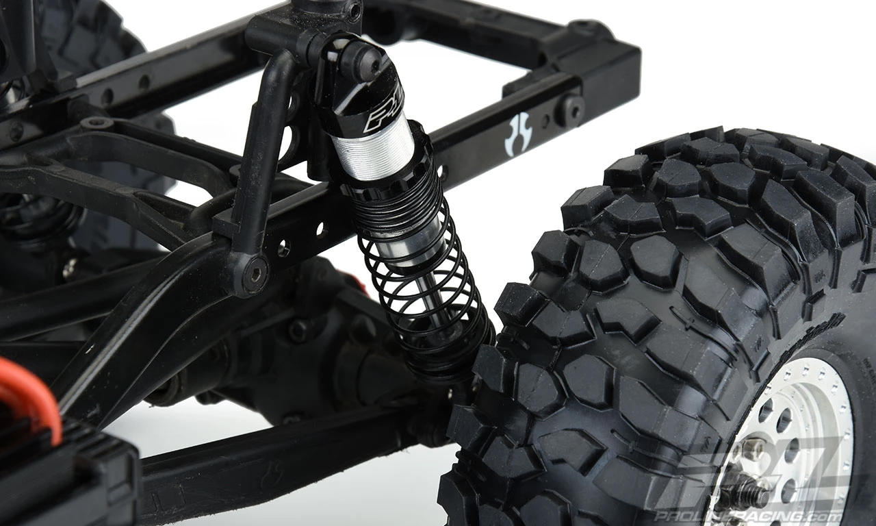 The new Big Bores are meant to stand out from the crowd with Chrome and Black anodizing and a large P-L logo engraved into the shock cap that will look good on any rig. Pro-Line also engineered an all-new dual-rate spring design made from a single spring that saves space and has incredible scale looks and performance. Optional softer and firmer dual-rate springs are available in the Big Bore Scaler Shock Spring Assortment (6343-02). The lower spring perch is captured, so you always know it will stay where it belongs during your adventures! From the top mounting hole to the bottom mounting hole, these Big Bore Scaler Shocks measure out to be 90mm at full extended length and collapse down to about 64mm (when the rubber bump stop is removed) and they include extra 5mm longer Shock Ends to increase the shock length! Just like Pro-Line’s extremely popular Pro-Spec Scaler Shocks, the Big Bores come mostly pre-built (just add oil) and are designed to fit many popular crawler vehicles.