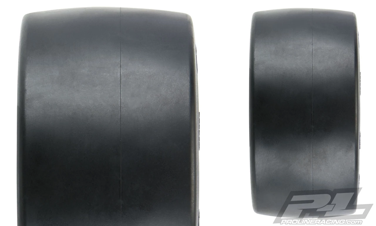 This is a pair of Big Daddy Wide Drag Slick SC Rear Tires. Are you searching for more grip off the line for your No Prep Drag Car? Is your car begging for wide drag slick rear tires to complete the authentic look of your build? Look no further than Pro-Line’s all-new Big Daddy Wide Drag Slick SC tires! The Big Daddy tire has a massive 2″ wide contact patch (25% wider than standard Short Course Drag Slicks) making them ideal for low-grip, no-prep surfaces while still fitting standard Short Course 2.2″/3.0″ wheels. Pro-Line engineers added extra webbing inside of the tire for added stability at the high speeds found in drag racing. The Big Daddy tire is made from Pro-Line’s MC compound which has become a drag racing favorite for its incredible grip on a variety of surfaces and its resistance to stretching. Pro-Line includes soft gray foam inserts to allow the Big Daddy tires to fully conform to the track surface and provide maximum grip. Don’t be left spinning your tires off the line; get yourself a set of Big Daddy Wide Drag Slick Tires now!