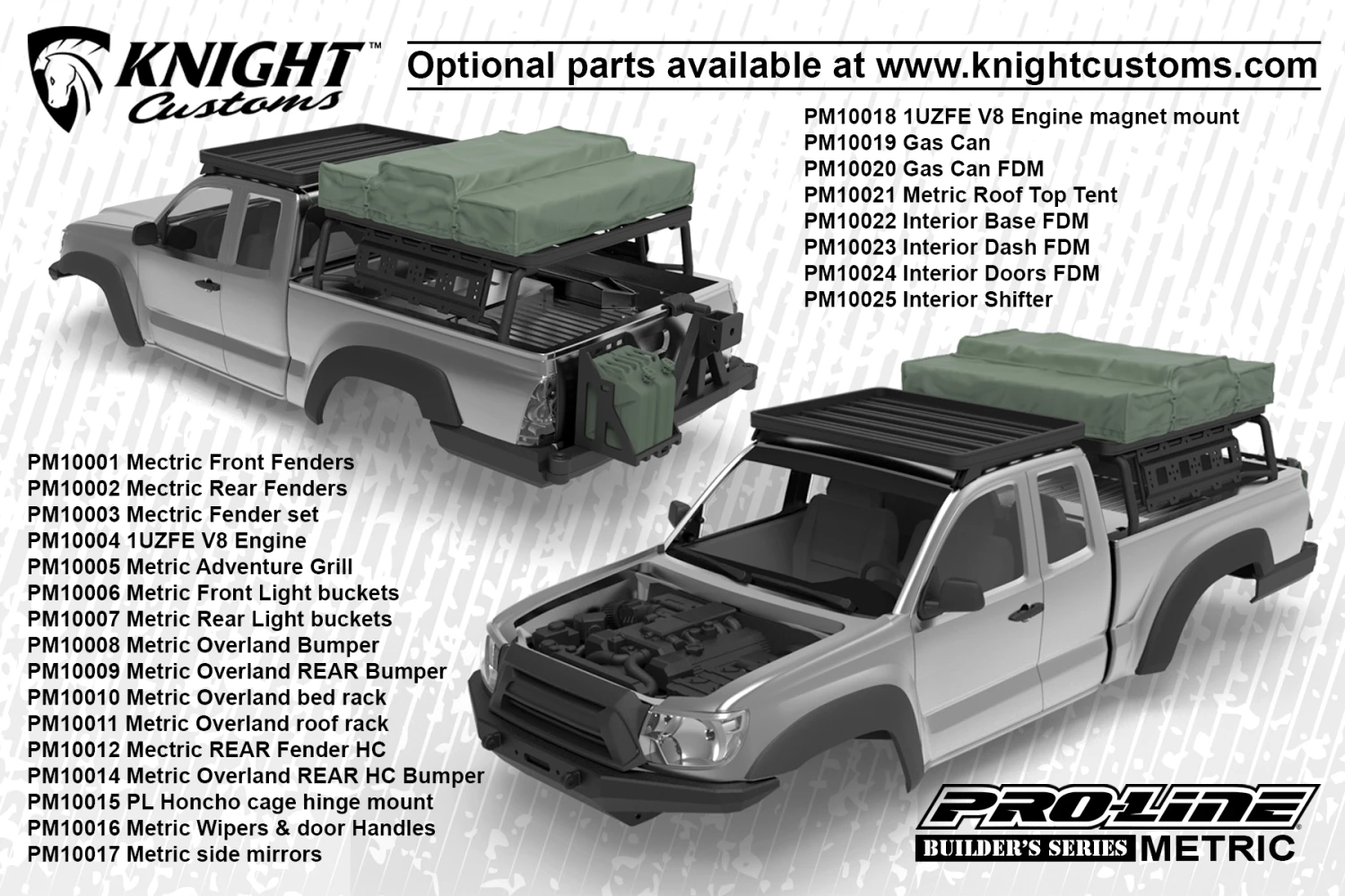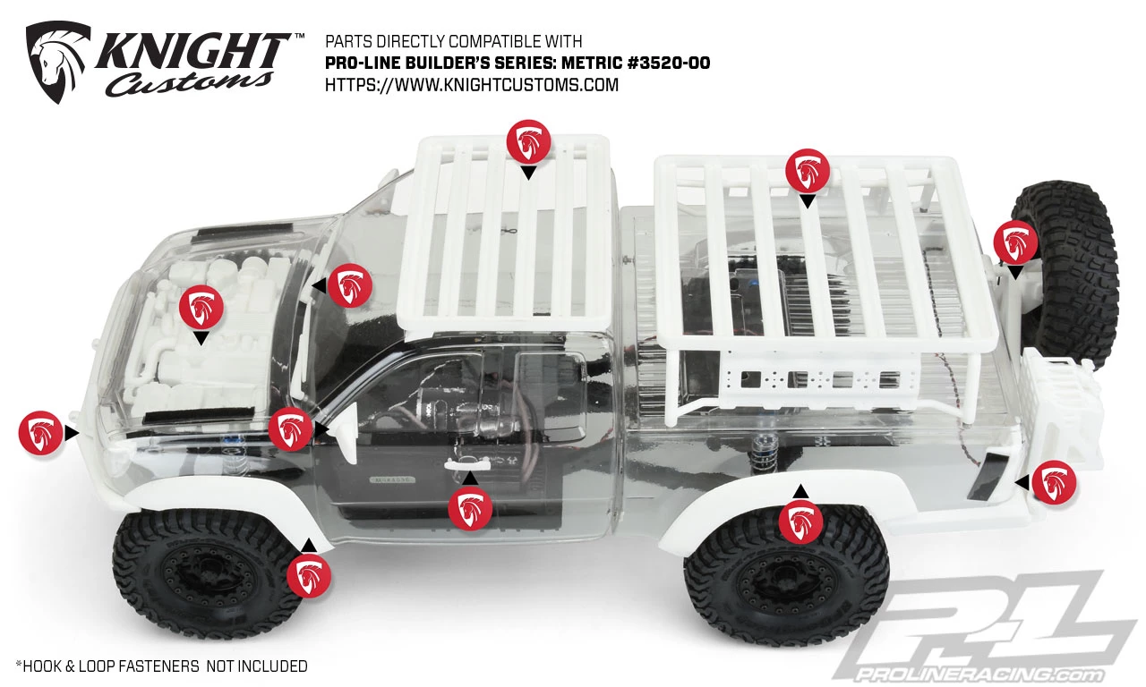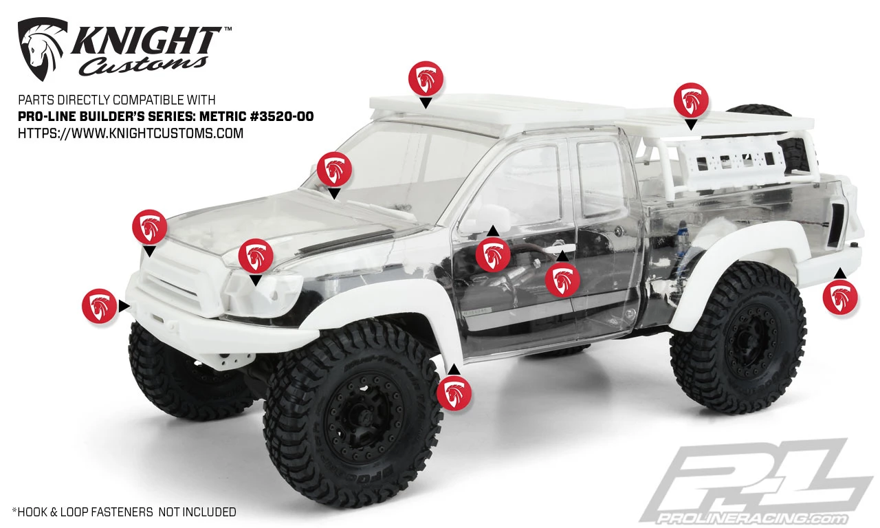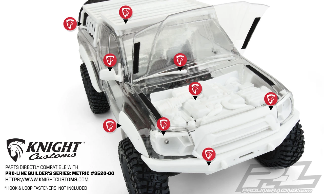 The Builders Series: Metric Clear Crawler Body. Pro-Line is proud to introduce the first in a new line of Crawler Bodies designed specifically for those who enjoy fully customizing their rigs the Builders Series: Metric truck body! Just like a full-size project truck that you build exactly how you want, the Builders Series: Metric Body allows for custom grills, lights, engine detail and nearly any other scale detail you can imagine with the help of 3D printing technology. Pro-Line has joined forces with leading custom 3D Scale Parts company Knight Customs so you have a ton of realistic scale option parts already available for your Metric build!