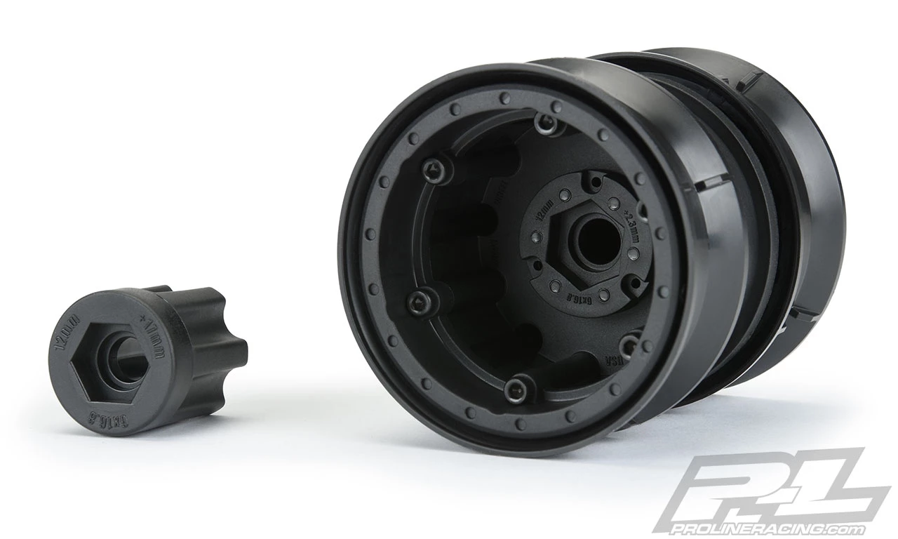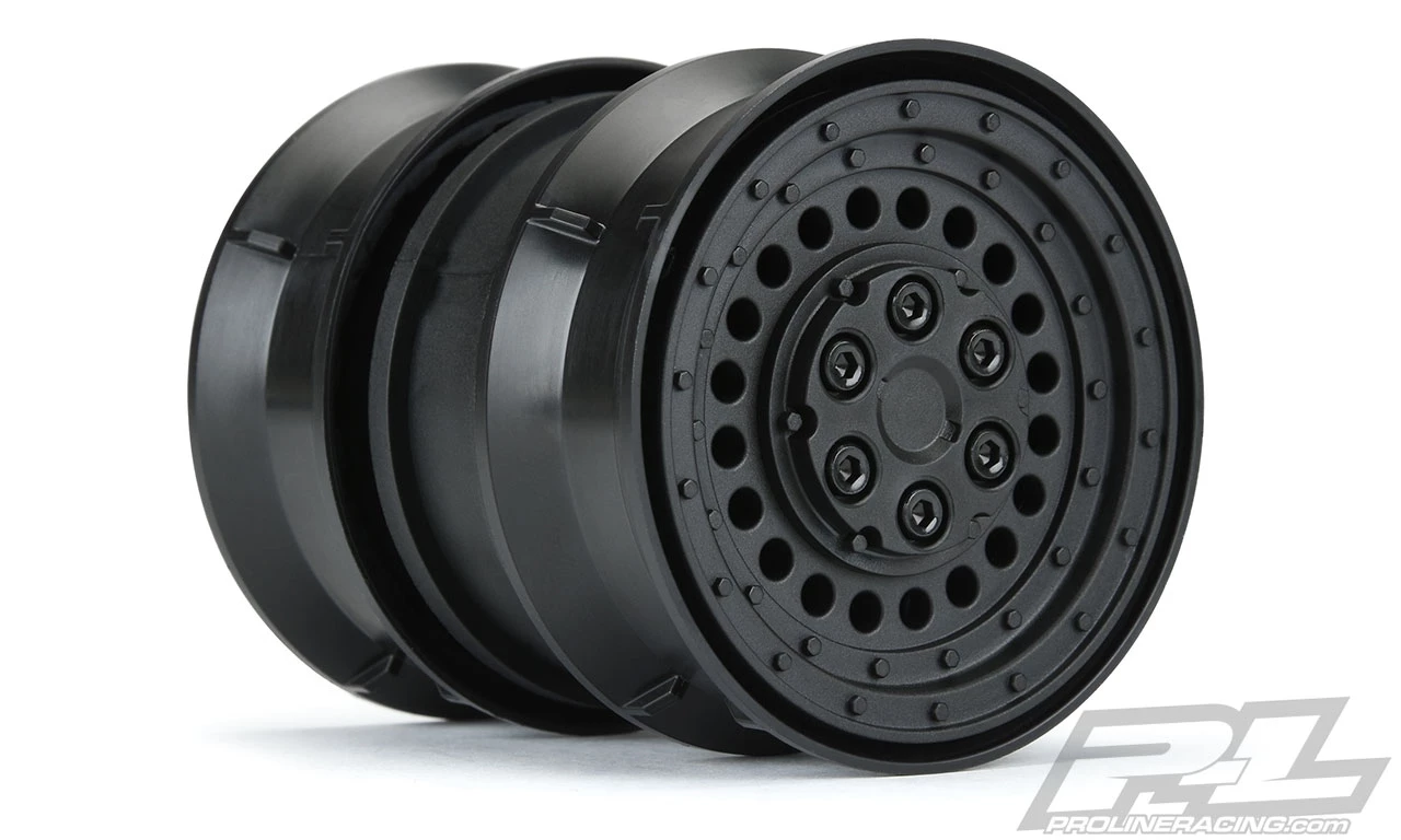 This is a pair of Carbine 1.9″ Black Plastic Internal Bead-Loc Dually Wheels. Pro-Line is proud to introduce our new Carbine 1.9″ Dually Wheels! This pair of Carbine dually wheels will go perfectly with your next military-style or extreme off-road build and will fit 4 standard 1.9″ tires, 2 tires per wheel. The best part of the Carbine is the modular wheel design that allows it to be used as a single tire wheel, dual tire wheel, or you can keep adding as many tires as you want with the addition of more Carbine wheels! The face of the Carbine 1.9″ wheel features 20 small holes with molded-in bead-loc detail for a tough military look. The included scale wheel nut cover attaches with two screws and completes the rugged appearance. The Carbine Dually wheel includes two optional 12mm hex offsets to fit both straight axles and portal axles and to give you the option for a narrow or wide offset. If you are looking for dually wheels for your build, then look no further than the most advanced wheels to date. Get your very own pair of Pro-Line modular Carbine 1.9″ Dually Wheels today!