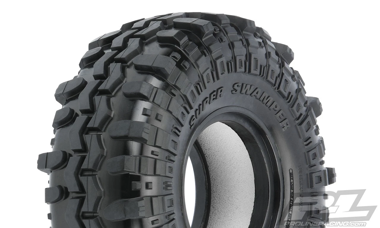 The full-size Super Swamper® TSL SX features the ultimate tire tread design by pairing the distinctive chevron tread pattern with the famous, trademarked, and patented Interco® TSL (three-stage lug) tread design. TSL is a lug pattern with short, intermediate, and long lugs that are each uniquely arranged, proportioned and spaced which allow them to bite quickly and self-clean rapidly. Each of these details has been faithfully recreated in Class 0 size to fit your 1.55″ wheel. Just like the full-size Interco® Super Swamper® TSL SX tires, Pro-Line tires are proudly Made in the USA!