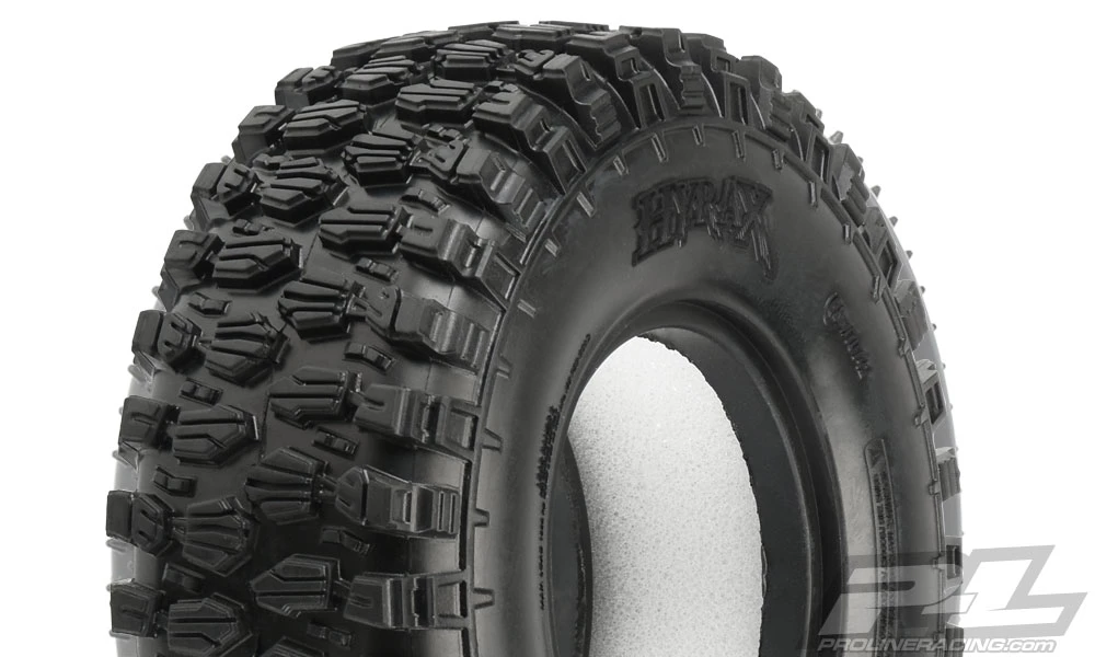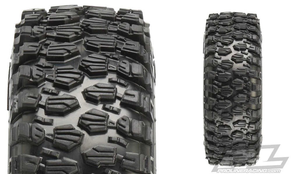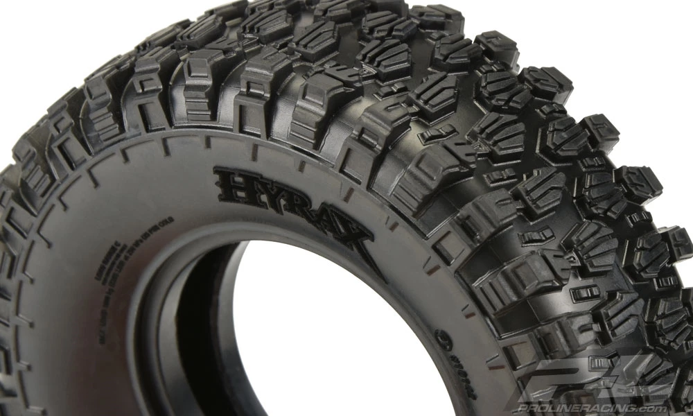 Class 1 Hyrax 1.9″ Rock Crawling Tires. The future of Class1 Tire Performance has arrived with Pro-Lines all-new 1.9″ (4.19″ OD x 1.4″ Width) Hyrax Tire! Designed from the ground up for maximum grip on the toughest terrain, the Class 1 legal Hyrax tire is ready for anything your Scale Adventure might throw at you. The Hyrax features an aggressive and open tread pattern with each tread block containing multiple Sipes for incredible tread flex while still looking great on a Scale Rig. The highly detailed connected tread on the sidewall of the Hyrax extends out for unmatched side-hilling performance and the futuristic stepped tread blocks create even more forward gripping edges that dig into slick rock like no other scale tire Pro-Line has produced to date! The Hyrax is made from Pro-Lines Legendary G8 material, so you know it provides performance you can depend on.