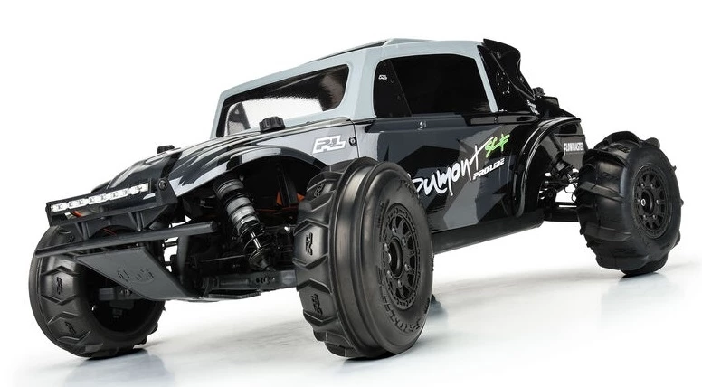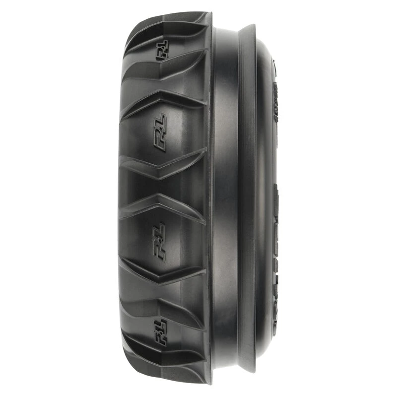 The Dumont SC Front tire uses a unique combination of V-shaped paddles and tall outer ribs. This gives your 4×4 Short Course vehicle enhanced steering response over traditional paddles, while still providing sand-throwing forward traction. Pro-Line P-L logos have been embedded into the tire carcass giving it the style that you have come to expect from Pro-Line. The Dumont SC Paddle tire gets its name from the incredible Dumont Sand Dunes in California, but these paddle tires are equally at home shredding your local snowfield in the winter.