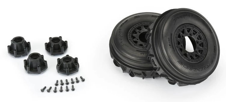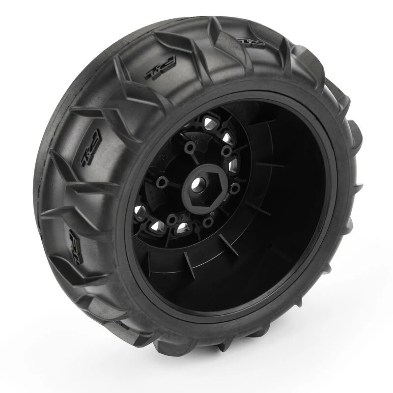 This is a pair of pre-mounted Dumont SC Front Paddle/Rib Tires on Raid Black 6×30 Removable Hex Wheels. Are you ready for the most extreme Short Course Paddle Tires Pro-Line has ever made? Introducing the Dumont SC Front Paddle/Rib tires that have been redesigned from the ground up to give your SC 4×4 even better handling and steering through the dunes or snow.