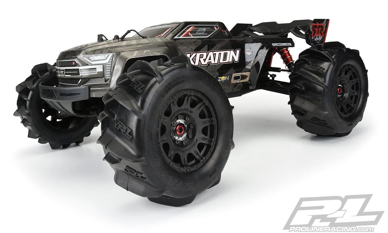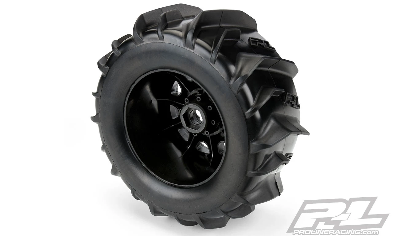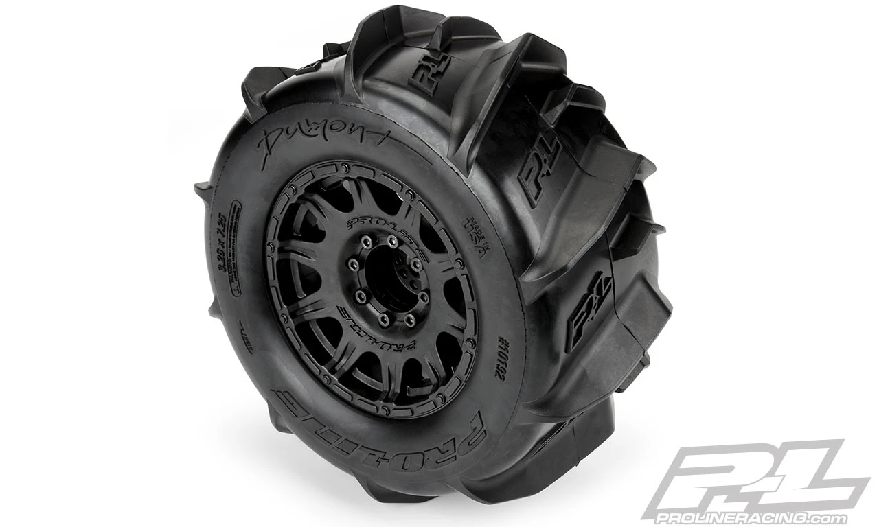 The Dumont 3.8″ tire uses the latest in paddle tread technology with large offset V-shaped paddles for maximum roosting power. Pro-Line P-L logos have been embedded into the tire carcass giving it the style that you have come to expect from Pro-Line. The Dumont Paddle tire gets its name from the incredible Dumont Sand Dunes in California, but these paddle tires are equally at home shredding your local snowfield in the winter. Don’t get stuck spinning your tires in the sand or snow. Get a set of pre-mounted Dumont Paddle tires for your 1:8 Monster Truck today!